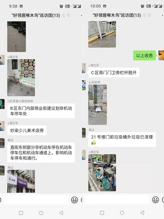 11月15日上午,阳光城市花园社区成立了好邻居“啄木鸟”市民巡访团。他们变身城市“文明啄木鸟”,活跃在社区的大街小巷,用热心和爱心建言献策,较真“挑刺”明察暗访,实时记录身边的文明与不文明,打造干净整洁环境,日复一日履行着巡查、走访、宣传、劝导等职责。活动中,巡访队伍化身“啄木鸟”,分时段、不定期深入居民小区、背街小巷等场所,对标对表,对城市公共环境、公共秩序、公共服务等方面存在问题以及市民不文明行为等进行监督、巡访和记录,发现问题立即整改,遇到现场无法整改的问题,则在工作微信群内“拍一拍”场所负责人,巡访团将隐患照片发到社区安全治理群,由社区负责督促相关单位负责人限期整改。巡访团成员不定时在“啄木鸟”工作群反馈身边的不文明现象,工作群将成为常态化反馈不文明现象的渠道。他们不仅较真地为文明“挑刺”,同时还传递着满满的“正能量”。