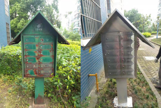 之前总有居民向社区反映,凤宾家园小区信报箱破损变形,油漆剥落,生锈腐蚀,特别是箱门的变形,让很多报箱关不上门,使得一些居民的报纸、信件经常丢失。信箱虽小,民生事大。了解到居民对更换旧报箱有强烈的愿望,社区立即启动邀约协商机制,邀请物业、居民代表等协商议事,最终由物业订制了一批新报箱,将凤宾家园一期、二期89个门洞的旧报箱全部进行了更换。
