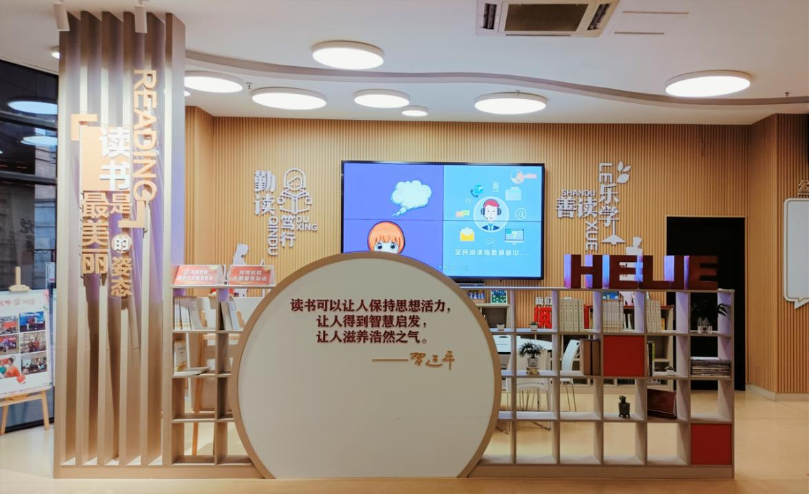强化阵地打造,构建良好的阅读环境。河埒社区充分延展党群服务中心的服务功能作用,将大厅一角改造成为社区“里仁”阅读点,满足居民日益增长的精神文化需求,并得到社区居民的积极点赞。洁白的桌椅、典雅的装饰风格以及醒目的“读书是最美丽的姿态”标语,为辖区居民提供一个温馨舒适的阅读环境。阅读点采用无人监管模式,涵盖党史学习教育的学习资料、生活百科书籍等,同时设置一个电子大屏幕,可同步播放各类宣传视频、海报,全面提升广大读者的阅读体验。
