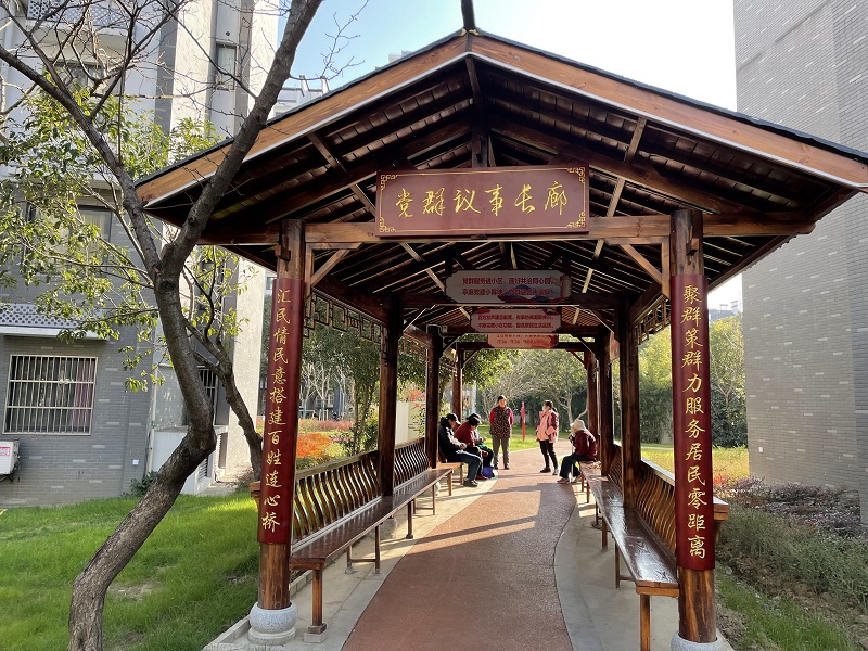 “汇民情民意搭建百姓连心桥,聚群策群力服务居民零距离”,近日,无锡市滨湖区荣巷街道荣巷社区梁湖南苑的“党群议事长廊”完成了楹联安装,这一“百姓微项目”正式竣工,小区里的老人们也高兴地聚在长廊里享受着冬日下午的暖意。