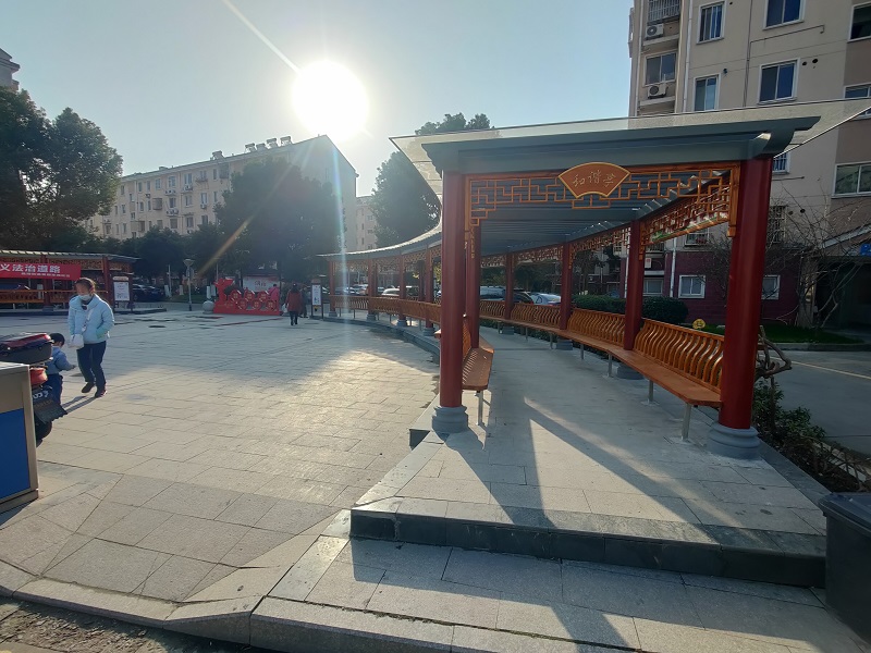 滨湖区蠡湖街道景丽东苑社区北广场位于小区中心位置,地方宽敞,两边绿化景观美丽怡人,小区居民都喜欢到广场上散步、休憩,开展休闲娱乐活动。然而广场上相对的两条休闲长廊因长年风吹日晒,导致木头立柱和座椅开裂,陈旧不堪并伴有安全隐患,改造休闲长廊成为小区居民期盼,也是景丽东苑社区放在心上的重点民生项目。