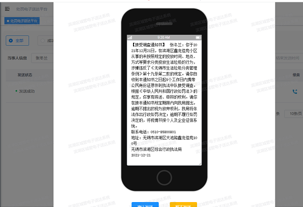 这份“电子调查通知书”出自荣巷中队近期启用的“滨湖城管电子送达系统”专用平台。通过电子短信送达的方式向当事人提供零接触式事先告知事项,快捷、简便的电子通知方式有效解决了执法过程中“反复跑”“无效跑”问题,也大大缩短了办案周期。