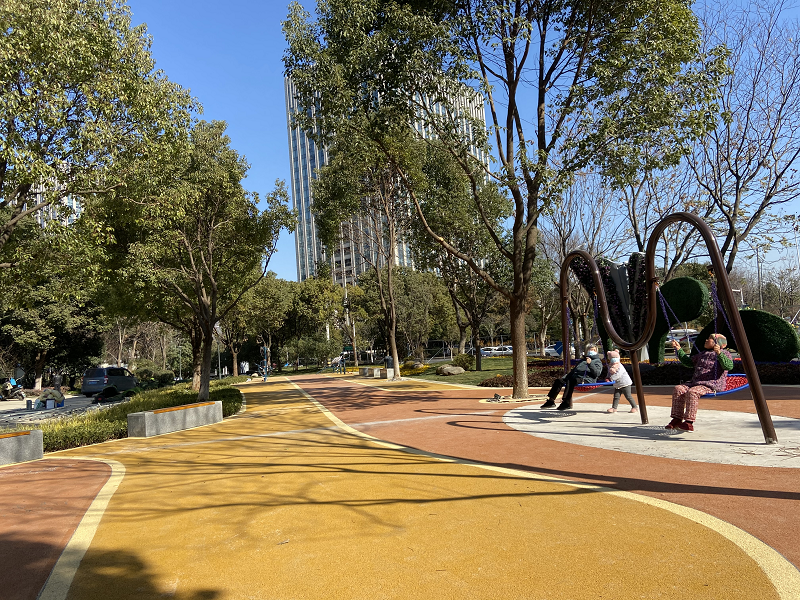 新开辟彩色健身步道,活力。为了让社区居民可以在小游园休闲散步、安全健身,社区特别开辟了一条长约500米的彩色健身步道,不论是饭后散步遛弯,还是清晨跑步锻炼,都怡情宜景。为了避免下雨天园内路面湿滑泥泞给群众运动锻炼造成不安全,此次改造,社区特意将园内路面整体加宽并抬高,在路面铺设材质选择上特别选用透水沥青,既美观又增加了摩擦力。园内还新增儿童活动区域,孩子们在家长的陪同下或畅玩秋千架,或摆动摇转椅,一时间,孩子们爽朗的笑声在园内回荡。