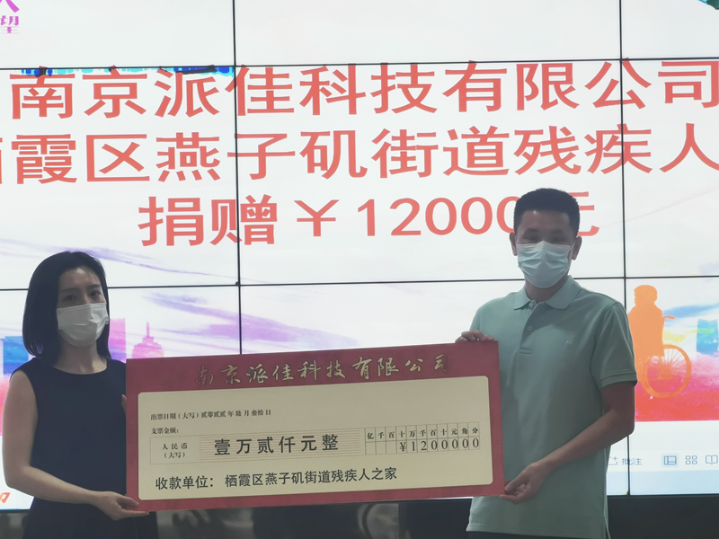 随后,戴梅主任代表南京派佳科技有限公司向燕子矶街道残疾人之家捐赠善款一万两千元整。燕子矶街道公共服务科肖雄军副科长进行致辞,对爱心企业表达了真诚的感谢,并表示:“南京派佳科技有限公司这一善举,正是体现了他们对残疾人事业的支持,对残疾人朋友的关心,残疾人事业的发展需要这样的爱心企业的支持,只有社会各界共同努力,残疾人事业的发展才会与时俱进。”