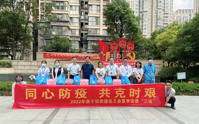 中国江苏网7月31日南京讯 炎炎夏日,热“晴”似火,南京拉响了高温橙色预警。工会“娘家人”情系高温下的一线劳动者,近日,燕子矶街道总工会持续开展以同心防疫 、共克时艰为主题的夏季三送慰问活动,虽然连日高温,但也不能阻挡送清凉的热情。街道总工会在张立新主席、舒馨副主席的带领下,为街道物业公司、中电建、新城指挥部、新就业形态劳动者及社区一线职工送去清凉用品。