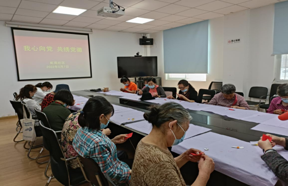 目前,疫情防控已逐渐进入到常态化,虹苑社区离退休干部于5月7日在社区多功能室举办“我心向党,共绣党徽”活动,党员、居民代表十余人积极报名参加此次活动。一个小小的绣花绷、一块红布、一枚绣花针、一根金色丝线,大家在老师的指导下穿针引线,一针一线的游走间凝聚真情,渐渐地一枚又一枚金色的党徽呈现在红色的绣面上。通过小小的针线,大家绣出了对党的热爱、忠诚与敬意,把爱党、敬党、颂党之情融进亲手绣的党徽中,以实际行动喜迎党的二十大胜利召开。党员苏叶英将绣好的党徽别在胸前,感到无比兴奋和自豪,她表示此次活动举办特别有意义,“大家亲手绣制党徽,把对中国共产党的热爱之情透过千针万线定格在党徽上。”