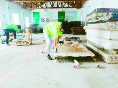 雨花台区大件垃圾分拣中心由一处闲置的茶厂改造而成,总面积约1500平方米。厂房内,杨兰英等3名工人正在拆解废旧床垫和沙发,身旁摆放着刀、锤子、手钳等随时要用的工具。把席梦思床垫放在地上,用刀割开四周,依次拆下布罩、海绵,露出铁丝弹簧架……10多分钟,杨兰英就完成了一张废旧床垫的拆解和分类堆放。