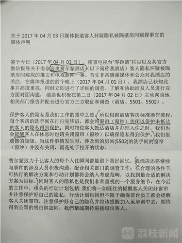 南京一五星酒店住客质疑“被走光” 酒店做出回应