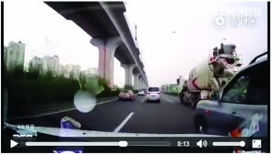 事故发生在9月23日上午8点19分23秒左右,视频是车载记录仪拍下的,时长只有19秒,只见道路右侧有一辆SUV打着左转向灯想要变道,拍摄视频的车在车道内正常通行。同时,画面中有人在说“来,再来,变,再变”。此后,想要变道的SUV前方出现了一辆搅拌车,随后SUV强行变道,随之与拍摄视频车辆发生碰撞,并失控翻滚。