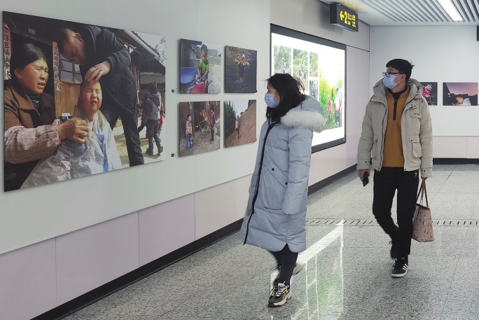 ④轨交三元坊站内的公益摄影展即将布展完毕,引人注目。