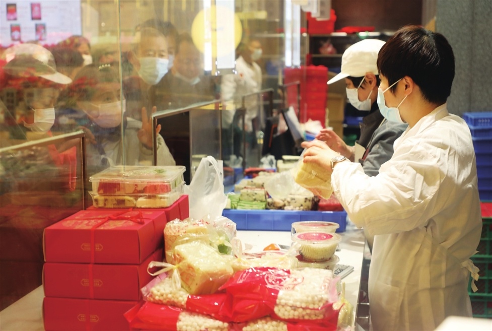 昨天,苏州一老字号糕团店内市民排队选购糕团。临近新年,苏式糕团供销两旺。糕团不仅香糯可口,而且讨“高高兴兴”“步步高升”等口彩,新年里自吃赠友两相宜。