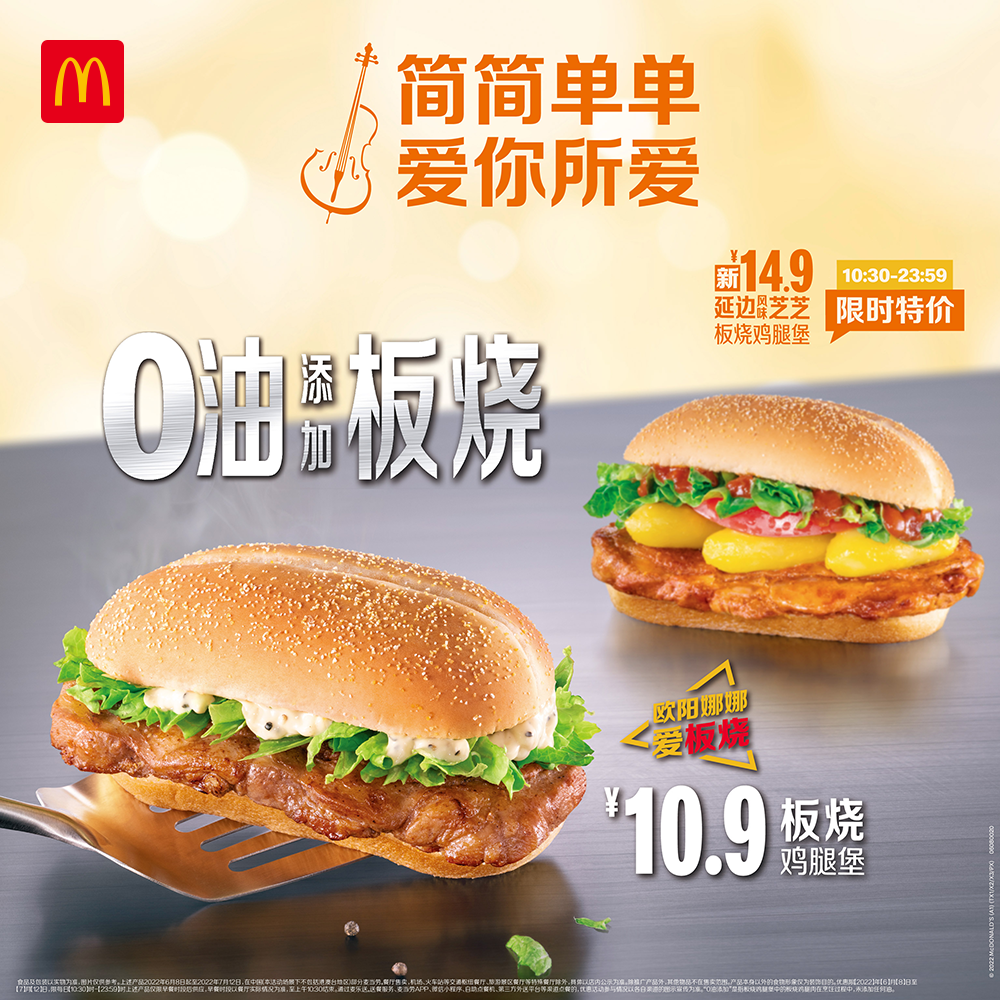 6月8日,欧阳娜娜正式加入麦当劳“明星热爱之选”。继歌唱家腾格尔、“亚洲百米飞人”苏炳添之后,欧阳娜娜通过麦当劳,分享了她简单热爱的故事,并推荐自己钟爱的板烧鸡腿堡。板烧鸡腿堡是本土研发的经典美味,以“0油添加”的简单烹饪和多汁的风味深受国人喜爱,今年也是其诞生20周年。6月8日麦当劳同步推出了板烧鸡腿堡限时10.9元等一系列庆祝活动。