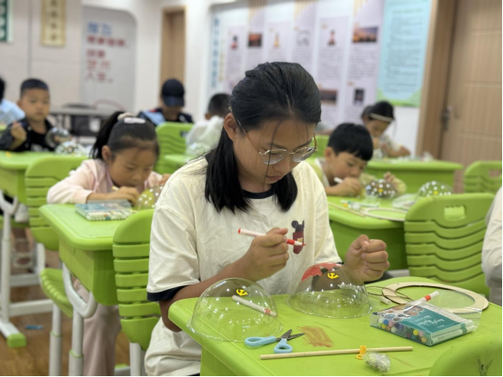 在老师的指导下,孩子们手握画笔,将科普知识融入创作:知道火星特征的孩子,用红、橙颜料绘制“红色火星灯”,还点缀黑色斑点模拟火星表面的陨石坑;了解地球生态的孩子,以蓝绿为主色调打造“蓝色地球灯”,用白色线条勾勒云层与洋流。活动现场氛围热烈,孩子们围坐在一起化身“小小宇宙设计师”,边创作边分享科普小发现。经过一个小时的创作,每盏星球灯都成为“微型天文科普作品”,既充满童趣又蕴含科学细节。