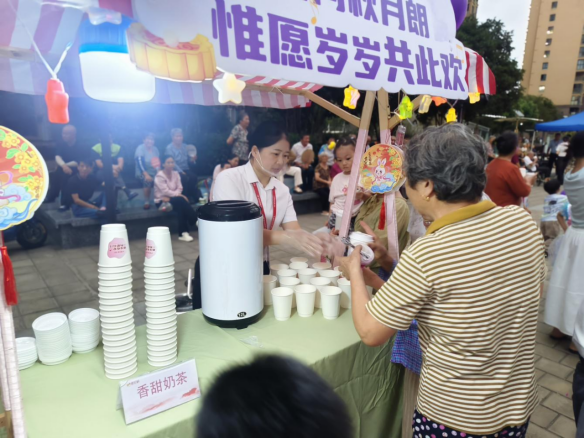 活动现场播放着中秋节相关歌曲,还为社区居民们准备了600个月饼和200份小杯奶茶。广场两侧的小食摊位也吸引了许多居民,凉粉、烤肠和爆米花等美味小吃均以每份1元的优惠价格售出,受到大人和孩子们的欢迎。