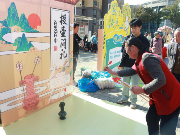 文艺表演结束后,大广场两侧的互动区域也开始热闹起来。游戏区排起了长队,居民们兴致勃勃地参与各项游戏。蔬菜套圈摊位前,大家认真瞄准,每当有人套中,便会引来一片喝彩;趣味保龄球考验着参与者的平衡与技巧;投壶场地更是围满了人,一支支箭矢落壶的清脆声响伴随着阵阵欢笑。参与游戏的居民可以领取集章卡,完成游戏即可凭卡进行抽奖、兑换香甜的重阳糕和精心制作的艾草香囊。