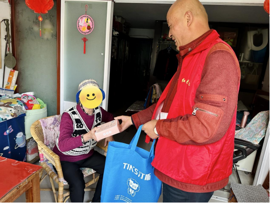 在独居困境人员钱叔叔家中,志愿者们不仅送上重阳糕,还主动帮忙整理堆积的废旧纸壳,与此同时,同行的物业维修师傅拿出工具,仔细检查家中窗户的合页与密封胶条,“您家阳台窗户主要是零件有些老化了,我下次带上零件帮您换,您近段时间关窗时要注意安全呀!”钱叔叔听后连声道谢,眼中满是感激。