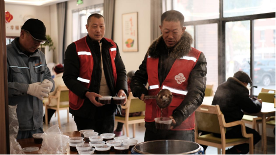 清晨的照料中心暖意十足,糯米、红豆、红枣、桂圆、莲子等十余种食材早已备好,经过提前浸泡、反复淘洗后,逐一投入大锅慢火炖煮。粥香渐浓,分装工作紧锣密鼓地展开。志愿者们将熬好的腊八粥细心盛入保温餐盒,确保送到每个人手中时依旧温热适口。随后,大家兵分多路,开启了温情送粥之旅。