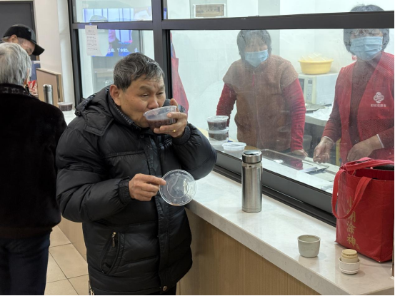 温热的腊八粥入口软糯,混着红豆、红枣、莲子等食材的香甜,从舌尖暖到心底,驱散了冬日寒气。活动现场,居民们捧着粥碗拉家常,还回忆起儿时腊八趣事,氛围温馨。针对社区独居孤寡老人,社区工作人员提前备好保温盒,盛上刚出锅的甜粥,上门为他们送去冬日温暖。“现在不缺吃的,但这碗粥喝的是念想、是热闹。”一位老人的话道出大家心声。本次“腊八送暖”活动,汤浜社区志愿者还为新就业群体送去热粥,让这份温暖传递给了在异乡工作的外卖、快递小哥们。