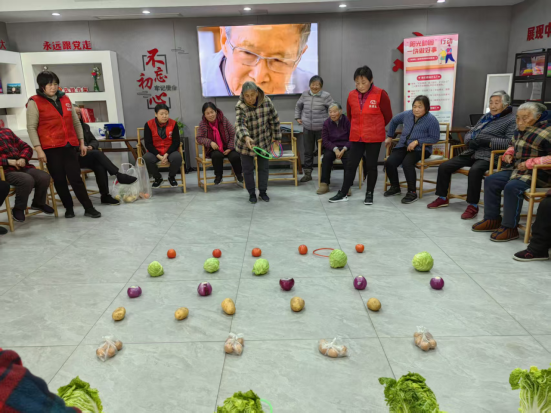 这边粥香暖心,那边蔬菜套圈游戏已热闹开场。初心驿站内,白菜、包菜等应季蔬菜整齐摆放,成为专属奖品。工作人员为老人们免费发套圈,大家有序排队投掷,套中者喜提“战利品”,未中者在邻里鼓劲中再试身手,现场笑声、喝彩声不断,满是烟火气。