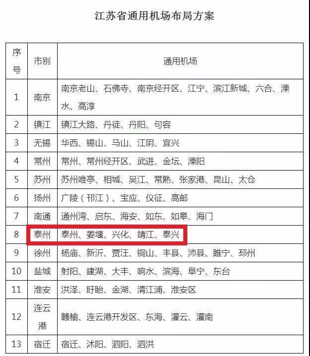 10月31日,省政府在南京召开专项规划新闻发布会,就全省高速公路、通用机场、内河航道等项目进行规划解读,其中,《江苏省中长期通用机场布局规划》提出:到2035年,全省通用机场布局35个,远期布局约70个,其中泰州的通用机场布局了5个。