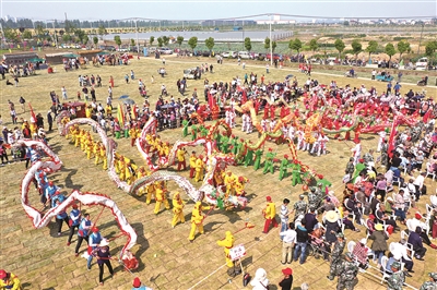 舞龙灯民俗节目吸引了众多游客观看。