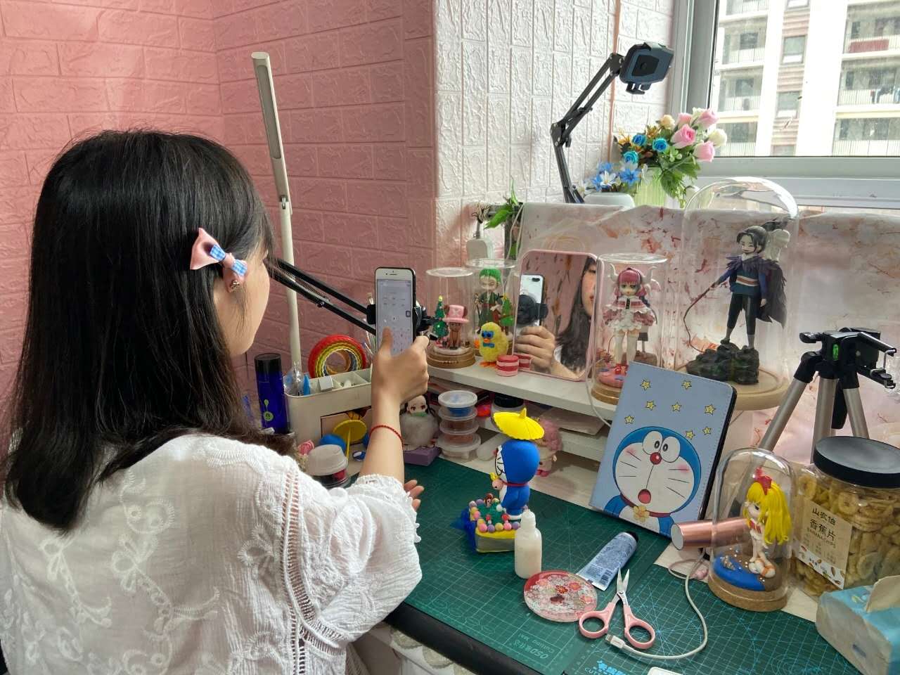 “有一次,我上初中的外甥女让我给她买粘土玩,买回来之后分了我一点,我就尝试着做了个拇指大小的小熊,感觉还挺好玩的,做着做着,就入迷了。”向晨曦说,自己原本就喜欢看动漫、做手工,在自学过程中,渐渐琢磨出了一套制作粘土娃娃的心得。2016年,正值网络直播流行,她将兴趣变为了“主业”,做起了励志主播。