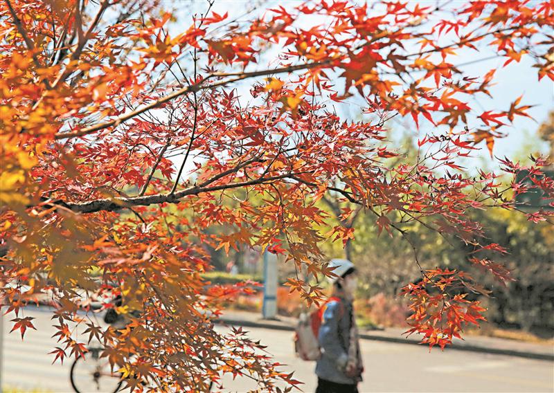 寒潮过后,除了变冷外,锡城还有一个变化就是:悄悄变色了。银杏叶渐渐变黄了,枫叶也逐渐变红,一出门就和秋天撞了满怀。绿化专家介绍,树叶的细胞里含有多种色素,如叶绿素、胡萝卜素、叶黄素等。在生长季节里,新叶绿素不断代替老叶绿素,使叶绿素在叶片中始终占绝对优势,遮盖了其他色素。秋天来临时,秋风带来了一阵阵寒气,叶子里面的叶绿素抵挡不住低温的影响,开始变得呆滞起来。新的叶绿素很难形成,原有的叶绿素逐渐又被破坏,叶黄素却依然如故,相比之下,绿色减退、黄色加浓,大部分植物的绿色衣衫换成了黄色。晚报记者 蔡佳/文 还月亮/摄
