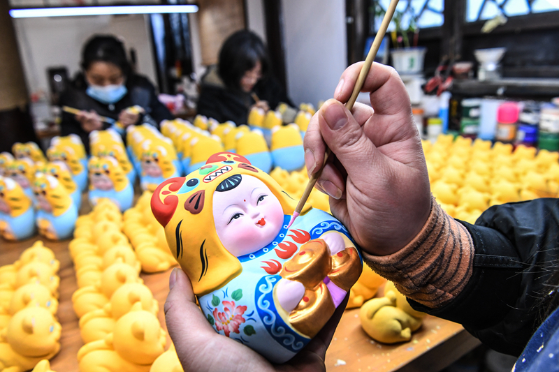 昨天,工艺师在彩绘贺岁泥塑。虎年春节前夕,惠山泥人研究所制作了一批无锡本地市民熟知的“阿福”“阿喜”贺岁泥塑,迎接即将来临的新春佳节。