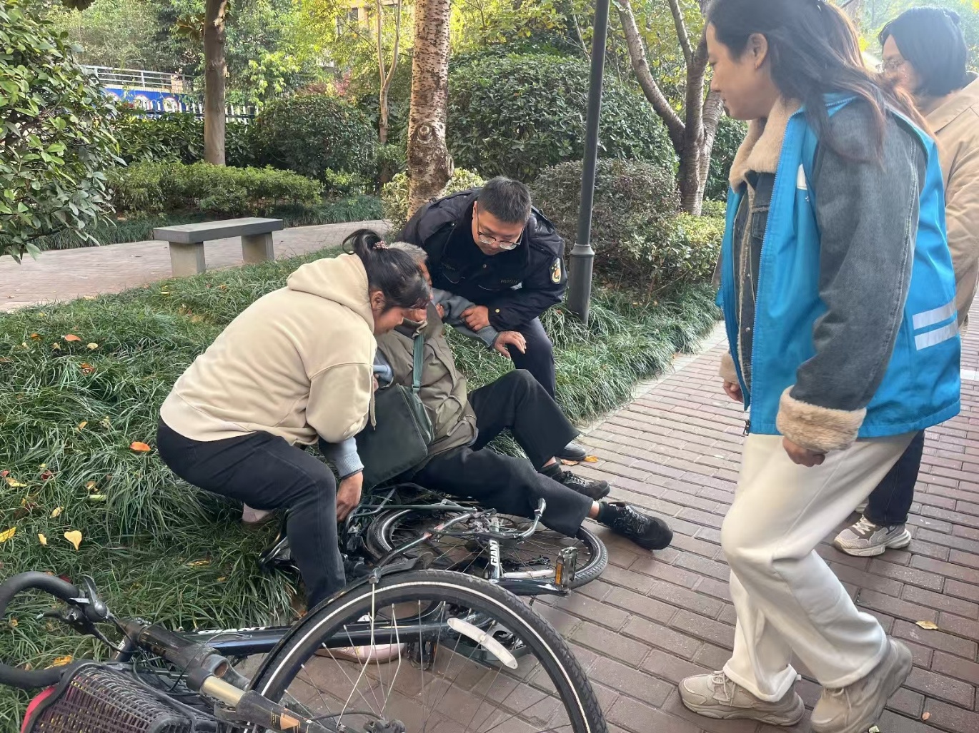 11月26日下午3点左右,梁溪城管山北中队队员在红光游园进行日常巡查时,便碰上一名独自骑车外出意外摔倒的老人。据了解,老人是惠峰社区的居民,今年60多岁,骑车时突感身体不适,头晕目眩,才不慎摔倒在地。在附近巡查的城管队员李云峰和魏烨发现后,立刻快步上前询问关心老人情况。
