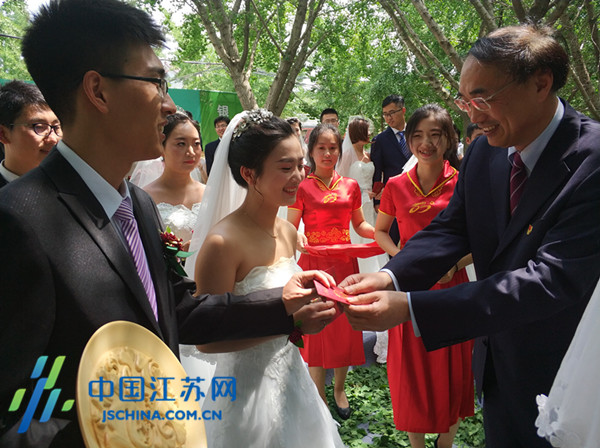 中国江苏网6月8日徐州讯(记者 张扬)今天上午,邳州银杏林时光隧道格外热闹。20对中国矿业大学的毕业生在这里举行浪漫的证婚仪式,将校园爱情修成正果。