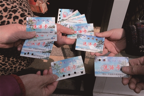 丁女士所称的乐家浴室在环城路东段路北,在一家宾馆的负一层。昨日上午记者未到现场,见到了丁女士等多位附近居民。丁女士拿出一叠浴室澡票卡告诉记者,去年底这家浴室发售便宜澡票卡,她花了200多元买了7张卡,每张卡能用10次,到上个月这家浴室停业前仅用了几次。“这家浴室一个多月前突然停业,今天我得知浴室开门,开始退钱,就赶紧过来。到地方得知,退钱的标准是每张卡每次2.5元,而当时购买时每张卡每次是3元,退钱标准‘缩水’,当然令人难以接受。”