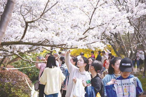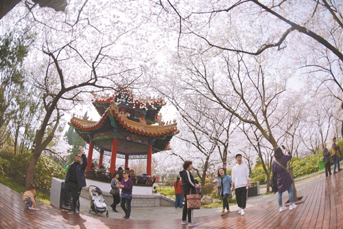 中国江苏网3月28日讯 3月26日,众多市民和游客漫步在彭祖园的樱花林中如醉如痴,流连忘返。又到一年樱花盛开时,彭祖园樱花林内满树樱花竞相开放,形成蔚为壮观的樱花花海,浪漫无处不在。作为我市最大的赏樱景区,彭祖园樱花林占地80余亩,园内定植樱花树3000余株,品种丰富,花色绚丽多彩。