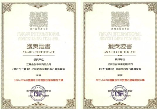 中国江苏网6月11日徐州讯 6月5日—8日,备受企业界、传媒界、广告界、商界瞩目的“澳门国际广告节”、“澳门国际创新节”在澳门科学馆隆重举行。颁奖盛典上,金彭凭借《金彭有嘻哈》原创歌曲、《疯狂的三轮车》网络大电影,斩获“2017-2018年度中国广告主年度整合营销案例大奖”,是今年澳门国际广告节唯一获奖的电动车品牌,也是今年唯一获得两个整合营销案例大奖的品牌。