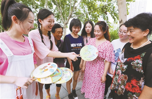 8月9日,鼓楼区黄楼街道万通社区举办“文明扇,送市民”青少年暑期社会实践活动,组织有一定绘画特长的青少年学生在扇面绘上文明宣传画赠送给市民,传递文明生活风尚。