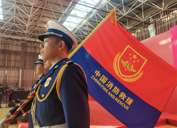 15时30分,仪式正式开始,3名仪仗队员护卫中国消防救援队队旗正步入场,步伐坚定。红蓝两色组成的中国消防救援队队旗是这支队伍的鲜明标志和荣誉象征。红色代表党和国家,蓝色代表消防救援队伍,寓意消防救援队伍是在党和国家领导下的纪律队伍;位于旗帜中央的旗标为橄榄枝托起的盾牌造型,象征着消防救援队伍是人民群众生命财产安全和社会稳定的守护者。