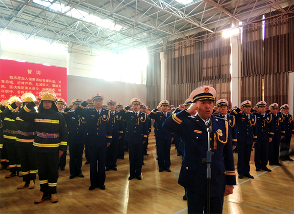 市消防救援支队政治委员姚鹏勇宣读了授衔命令。“对党忠诚、纪律严明、赴汤蹈火、竭诚为民。”市消防救援支队支队长梁军带领消防指战员庄严宣誓。铿锵有力、掷地有声的豪迈誓言,是全市消防救援指战员重整行装再出发的号角,更是对党和人民作出的庄严承诺。