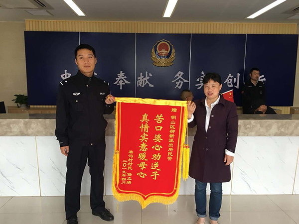 中国江苏网4月28日徐州讯 4月23日上午,柳新镇村民张静(化名)手持写有“苦口婆心劝逆子,真情实意暖母心”的锦旗来到柳新派出所,感谢该所为其劝诫逆子迷途知返。