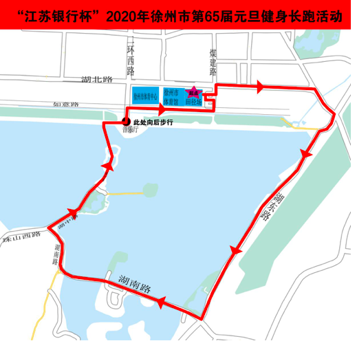 本届元旦健身长跑活动路线与去年一致。方队在湖北路体育中心田径场集结,由田径场围栏北门出发,行进路线为:湖北路田径场(起点)-煤建路-湖北路-苏堤路-湖东路-湖南路-珠山路-湖中路-音乐厅广场(跑步终点,此处长跑方队改为步行)-如意路-湖北路田径场,全程约7500米。这是江苏省最美跑步路线,地处5A级景区云龙湖核心地带,沿途湖光山色,风景旖旎,也是广大健身爱好者运动首选地。