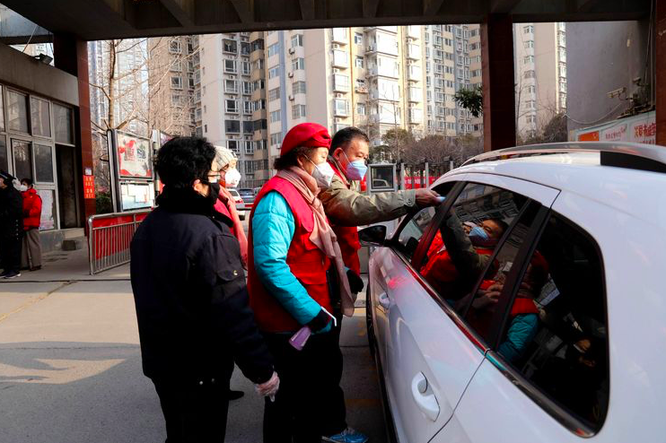 红色的党旗格外亮眼。党员志愿者们守在两侧,对进入小区的人员进行体温测量。
