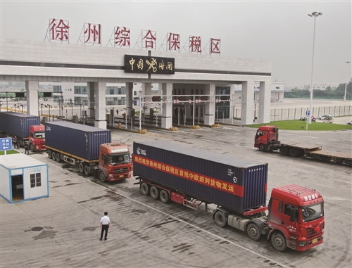 徐州海关提供的数据显示,徐州综合保税区首批中欧班列货物共申报8票报关单、50个40尺集装箱,货重1000吨;由徐州综合保税区区内企业托弗国际货运代理公司装箱、徐州中嘉国际货运代理公司承运、中国检验认证集团徐州分公司报关。该批货物采取“区港联动、整报分送”的监管方式、“公铁联运”的运输模式,以徐州综保区关区代码2337报关后,经淮海陆港铁路货运中心中欧班列平台查验、装运,通过霍尔果斯口岸出境,发往哈萨克斯坦的阿拉木图。