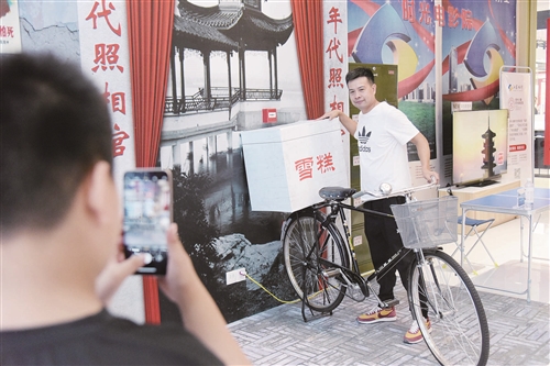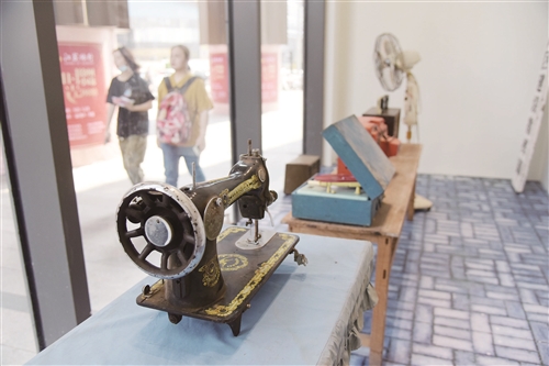 在市中心金鹰国际购物中心A座一楼东入口处,“暖心向上小康路,幸福徐州大家庭”的大红对联引人注目。进入门内,临时搭建的记忆杂货铺、老式电话亭、自行车等场景和物件,唤起人们对改革开放峥嵘岁月的回忆。