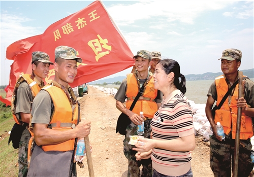 拥军模范程雁赴江西九江慰问抗洪抢险的驻徐某部官兵。
