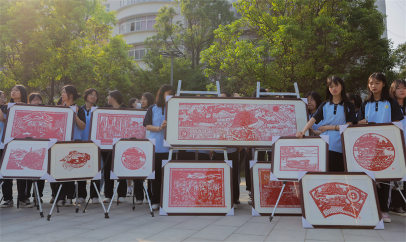 展览开幕式在学校国旗广场举行。师生们精心创作的76件作品在广场依次排开。原创作品从开天辟地——新民主主义革命时期、改天换地——社会主义革命时期、翻天覆地——改革开放时期、感天动地——中国特色社会主义新时期四大篇章选取经典素材进行创作,涵盖剪纸、刻瓷、香包和面塑四种非遗表现形式。
