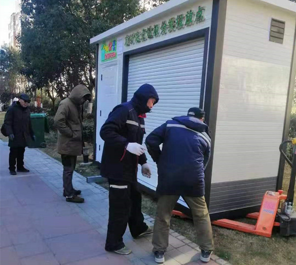在万科城小区的垃圾分类收集站可以看到各个站点均配备有宣传栏,张贴着公示信息、导向牌、垃圾分类指导图等,站外还设有便民洗手盆。为更好地进行垃圾分类宣传工作,还对站点进行了加装升级,每一个站点都增设了遮雨棚,不仅为居民们下雨天倒垃圾提供了方便,还为志愿者们解决了“下雨无处躲”的难题。