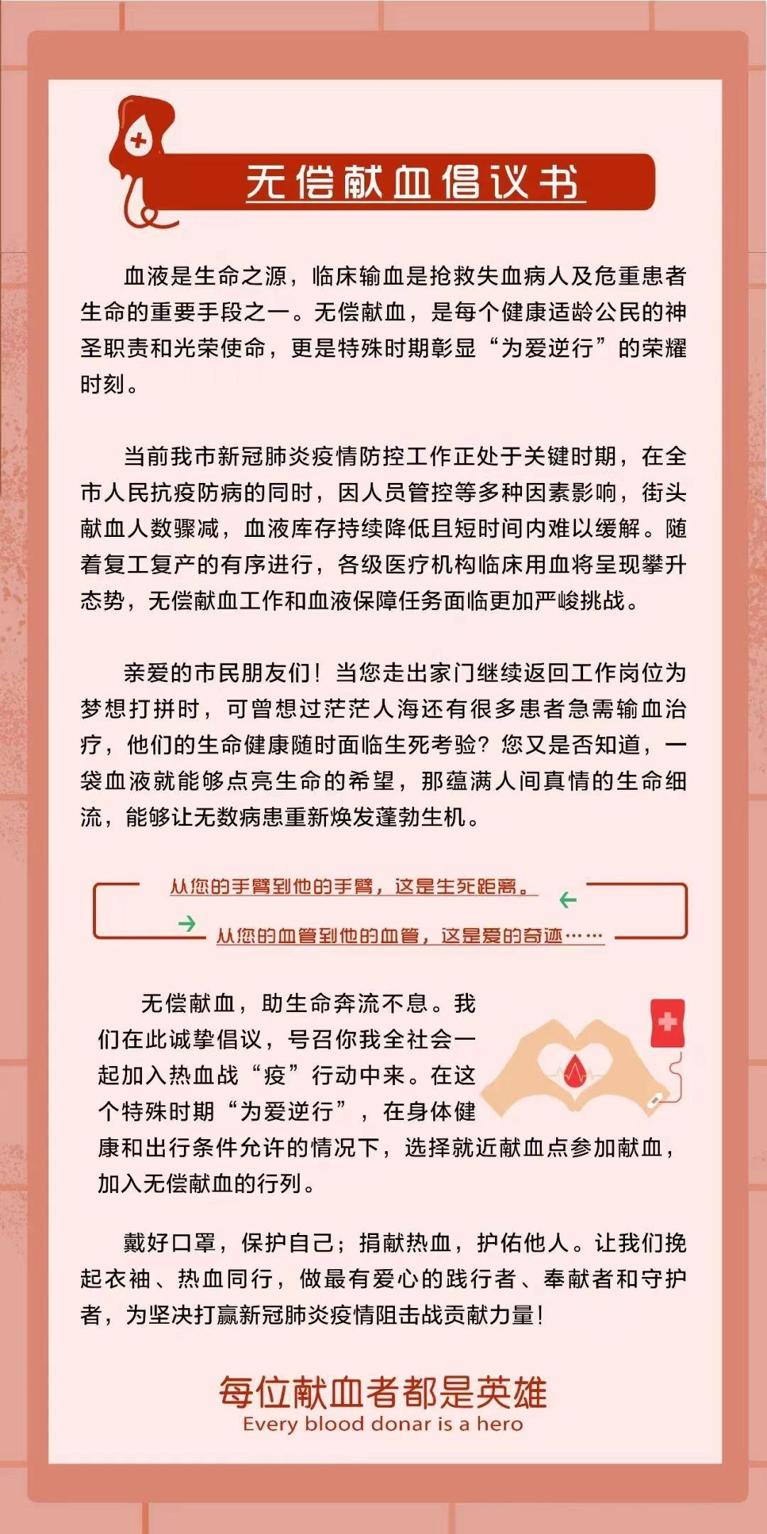 为切实保障疫情防控期间徐州市临床用血需求,徐州市红十字血液中心13日发出一份无偿献血倡议书,号召市民在身体健康和出行条件允许的情况下,有序参与到热血战“疫”行动中来。