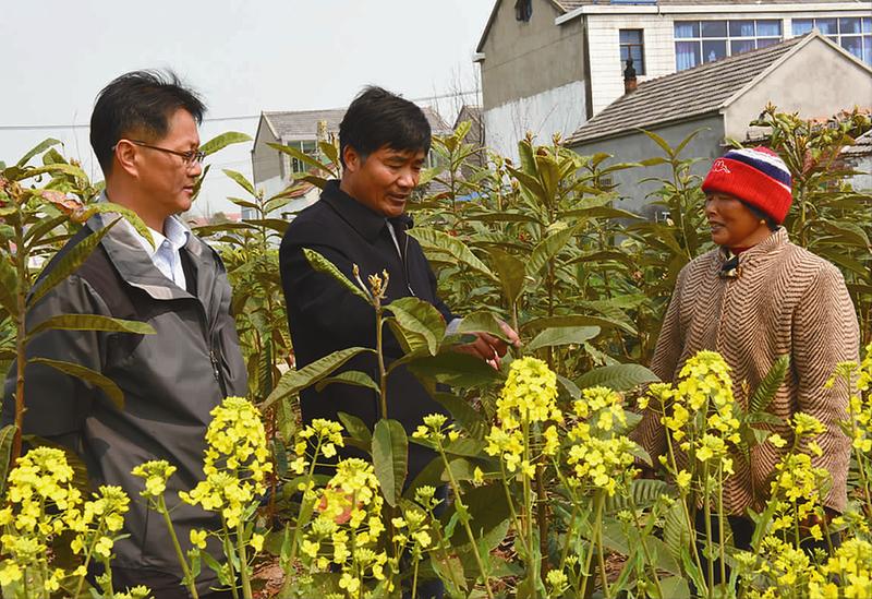 胡立春和市扶贫工作队的工作人员查看村民家枇杷树苗的生长状况。
