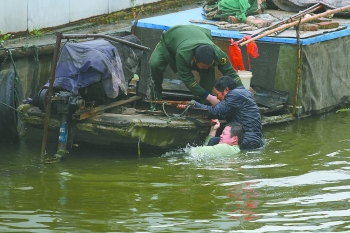 昨天下午1时,盐城边防支队中路港边防派出所民警王睿文正在黄尖镇中路港望鹤西路走访,就在他和几位村民聊天的时候,突然听见有人喊:“不得了啦,有人掉进河里了!”王睿文听到呼救,循声望去,只见不远处中心河里一条渔船旁边,有一个脑袋正在不停地上下起伏。“我当时冲到河边,只想着自己会游泳,救人第一。”他一边跑一边脱下制服,顺着6米高的河堤跑了下去,一下子就纵身跳进河里。