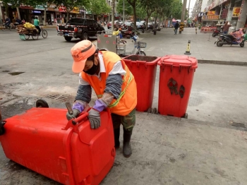 环卫工人在清洗垃圾桶。