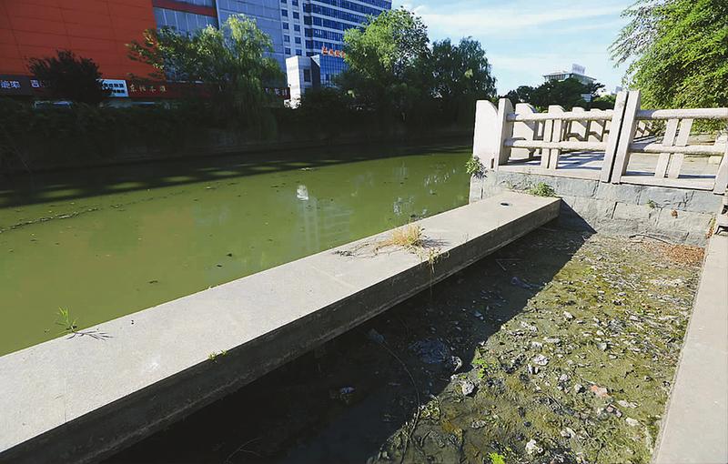 迎宾路第一沟,河面上漂浮杂物,河水发黑,臭气熏天。