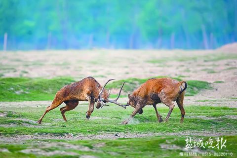 中国江苏网6月20日讯 6月18日,江苏大丰麋鹿国家级自然保护区,一年一度的鹿王争霸正在进行,两只雄鹿为争夺鹿王激烈厮杀。其中一只雄鹿虽已失去双角仍不放弃努力,全力抵抗对手的进攻,以失败而告终。失去双角的雄鹿神情落寞。截至当日,该保护区内已经产生了几十只鹿王,今年的鹿王争霸赛也基本落下帷幕。